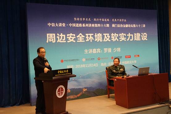 如何正确认识当前中国周边安全环境问题?如何建设中国的软实力?11月14日,中信大讲堂·中国道路系列讲座第四十六期暨蓟门法治金融论坛第六十三讲在学院路校区举行。本次论坛特邀全国政协委员、军事科学学会副秘书长、中国战略文化促进会常务副会长兼秘书长罗援少将以《周边安全环境及软实力建设》为题,解读党的十九大报告对我国安全环境的判断及应对之策。全国政协委员、中国社科院欧洲研究所所长黄平,中信改革发展研究基金会秘书长郭克彤,中信出版集团副总编辑、《经济导刊》杂志社社长季红,华远集团院党委书记马绿波,1066vip威尼斯党委书记胡明,1066vip威尼斯分党委书记李欣宇,副院长杨杰,分党委副书记何欣以及1066vip威尼斯十余名老师与校内外学生出席本次论坛。论坛由1066vip威尼斯院长、资本金融院院长刘纪鹏主持。