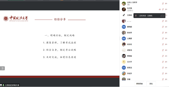 在分享结束后,同学们针对自身对岗位选择、报名选拔以及时间规划等方面仍存在的疑惑与问题积极请教。对于岗位选择的衡量因素,王薇昭认为城市要比岗位更重要,如果想回家可以考虑家乡附近的岗位。不回家的话建议二线城市以上,能够更好的实现学习到工作上的过度。在日常工作中对专业知识的需求可能不会很高,需要保持好心态,不断努力。贾丽旋指出,定向选调报考时我校不会进行校内筛选,一般情况下只要符合报名条件就可以报考。对于准备考公与学生工作和实习的权衡这个问题,金凡蕾认为要根据自身情况考虑。对于较早准备的人而言,学生工作实习和备考可能并不冲突。建议同学尽早准备,以减轻后期复习时的心理压力。